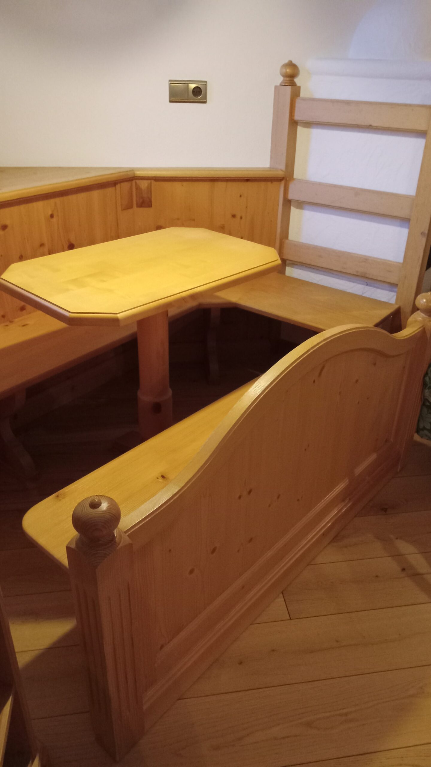 Then I realised it was a free standing bench that was pushed up against the bed to look like a footboard. The bench could be moved next the the table in the room to make more seating space. I love seeing furniture that has more than one purpose.